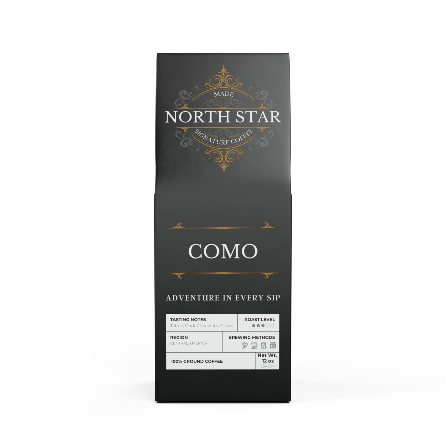 Available in whole bean and ground options, North Star Signature Coffee's Como Medium Roast Coffee is roasted with care in the USA, ensuring a superior experience from start to finish. 12oz Package.